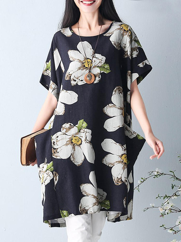 • S-5XL Femmes Casual Dress Loose Boho Col Rond Imprimé Floral Dress