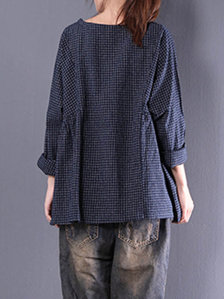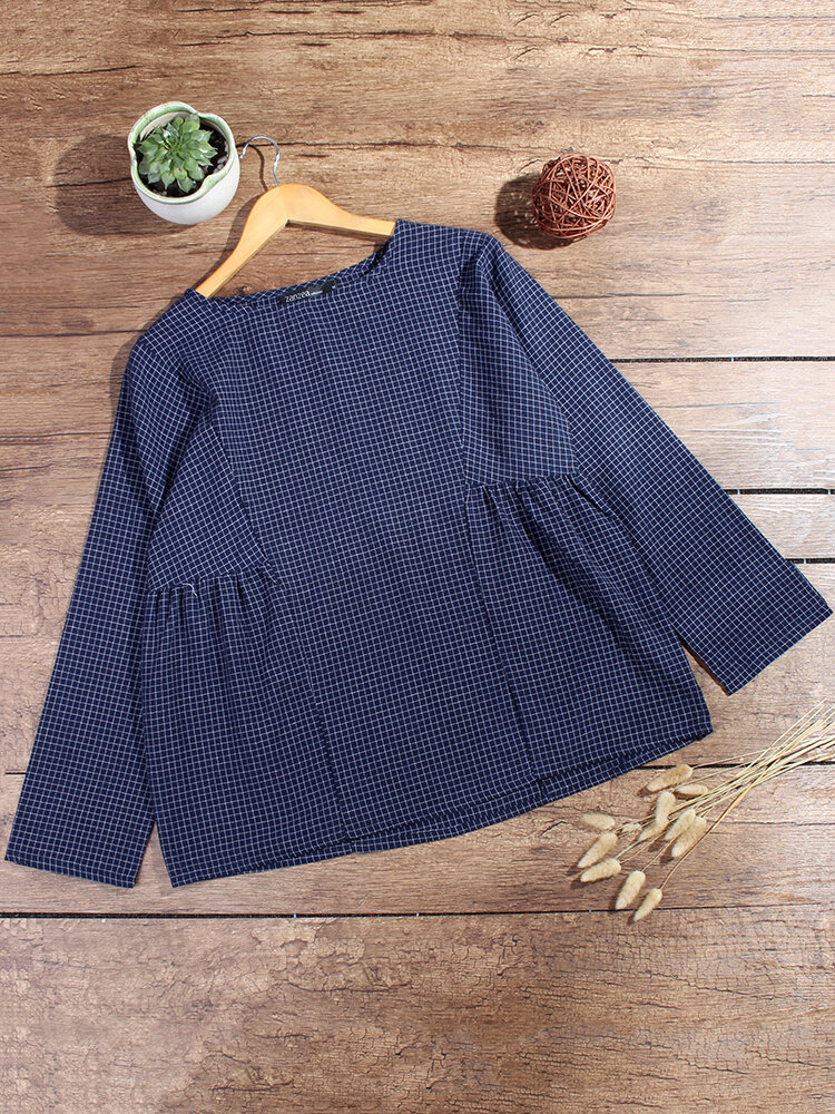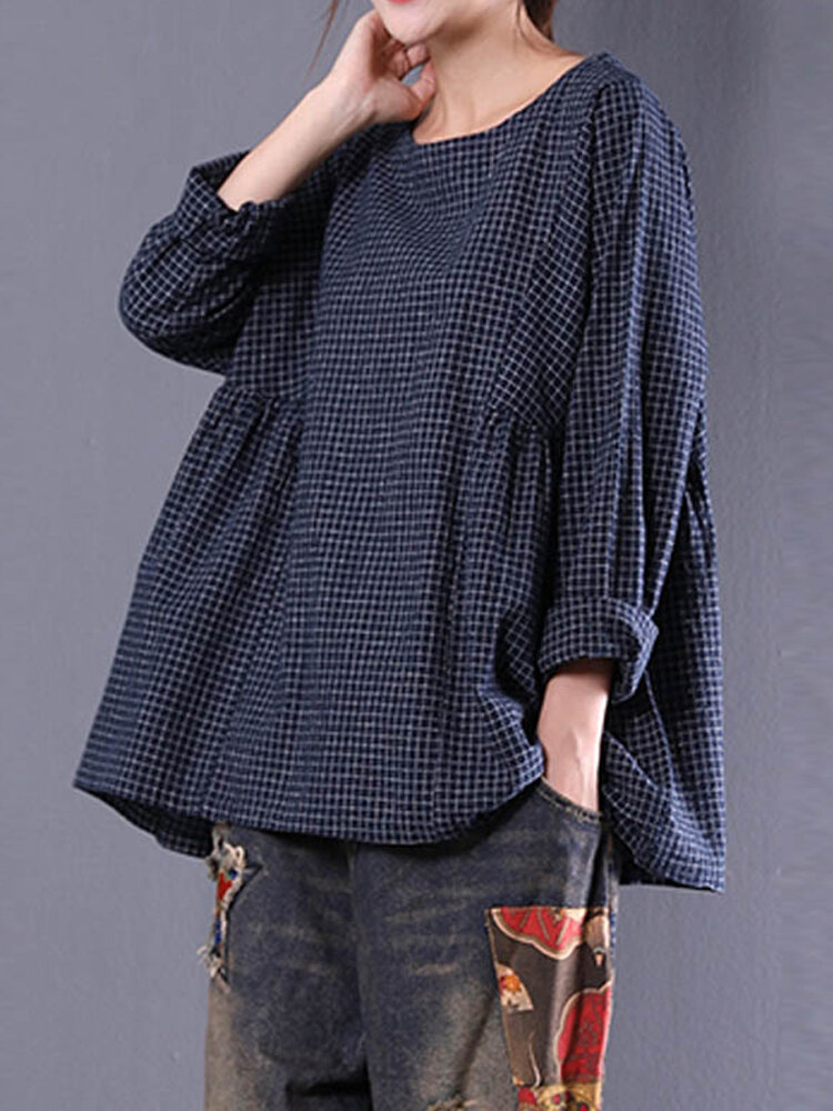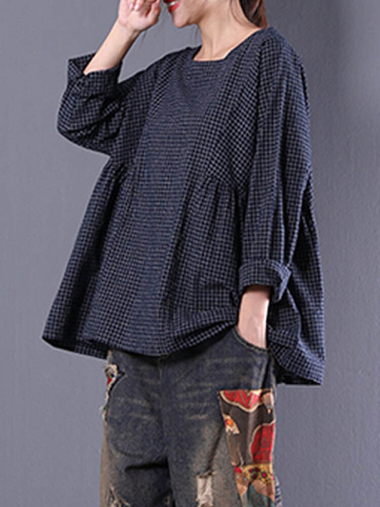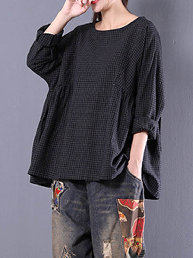 • Femmes Crewneck Check Manches Longues Lâche Blouse Bouffante