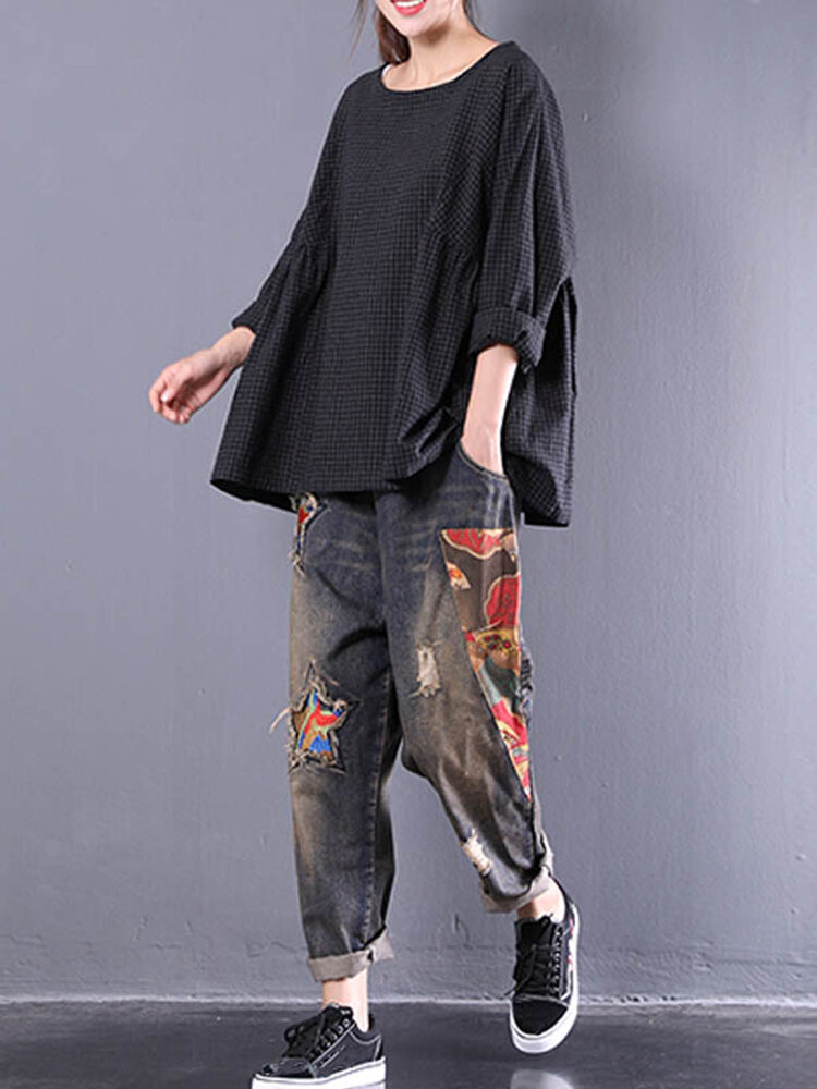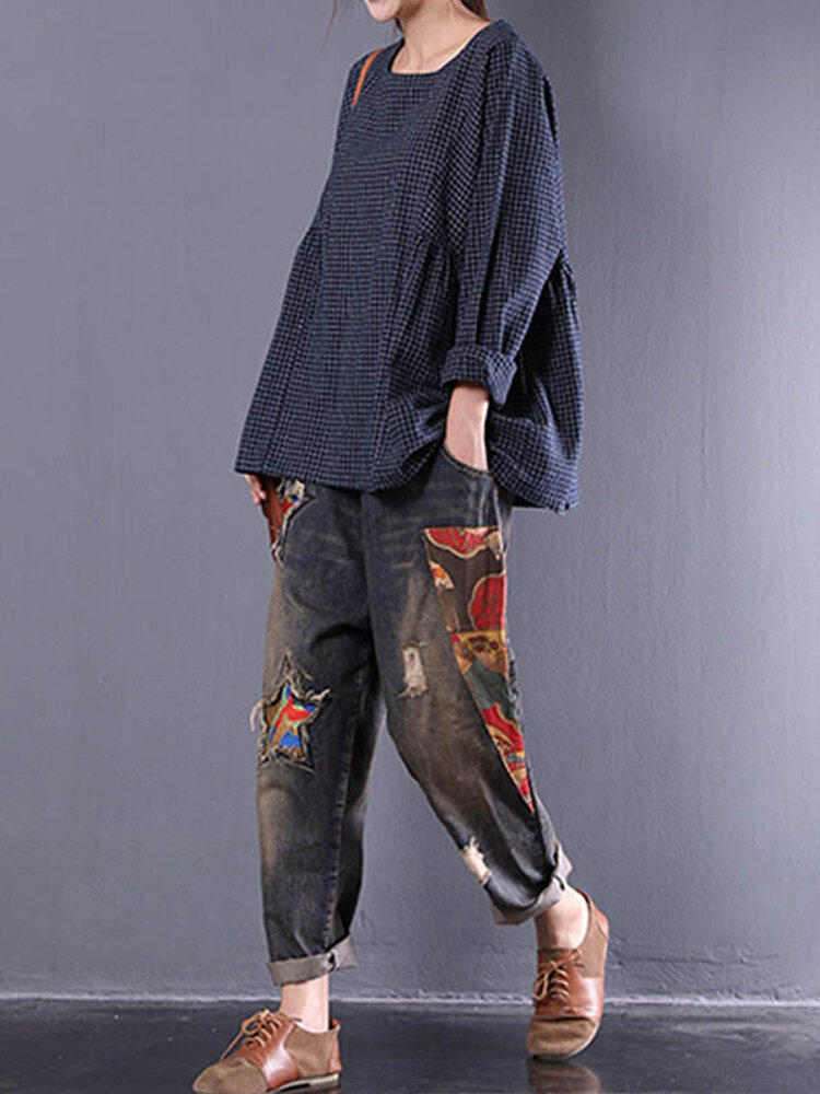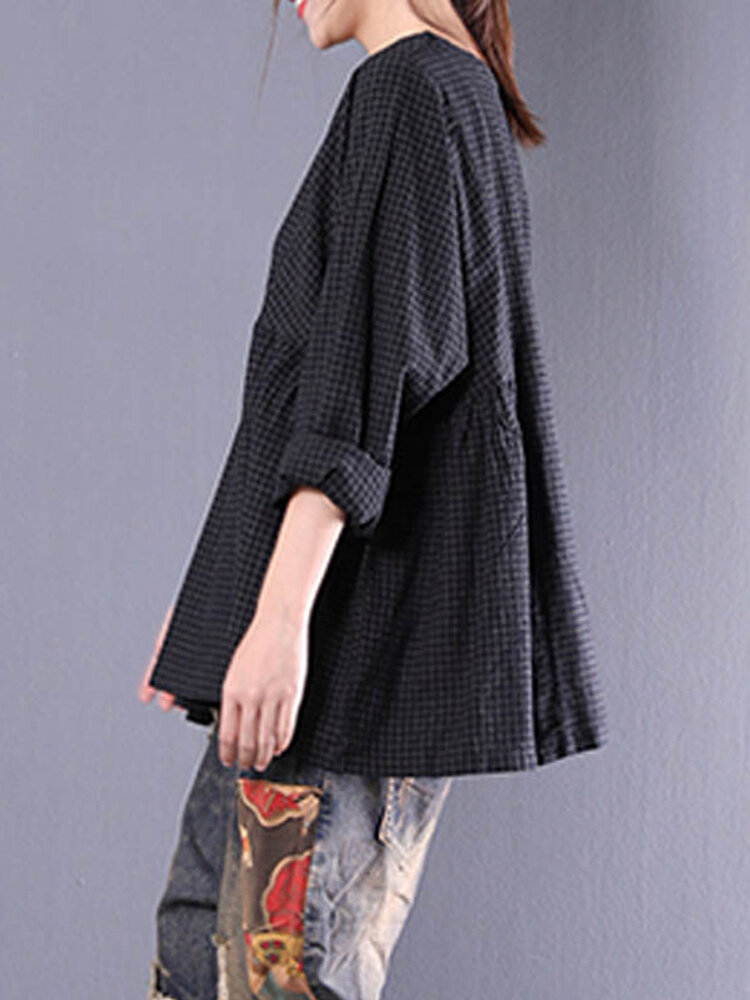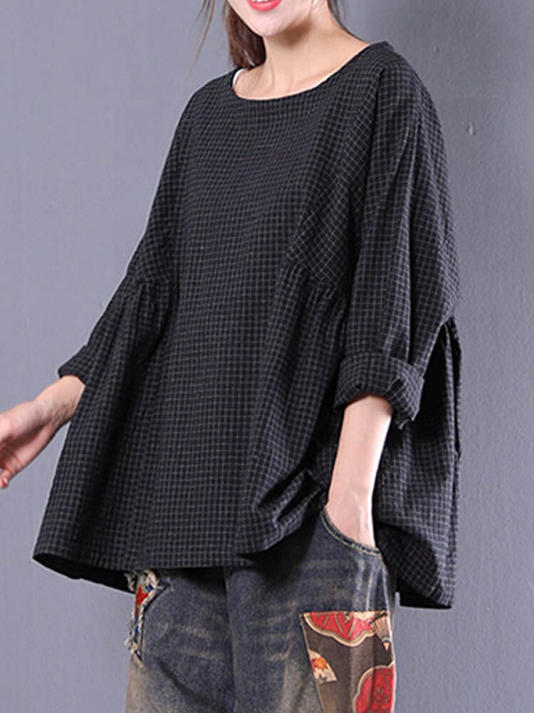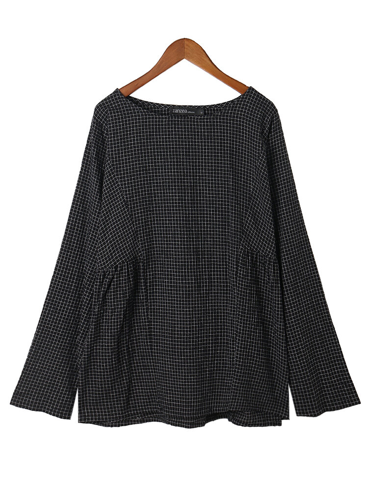 • Femmes Crewneck Check Manches Longues Lâche Blouse Bouffante