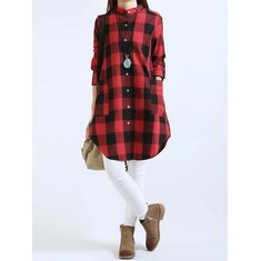 Femmes Blouse Décontractée Lâche Plaid Poche Bouton à Manches Longues