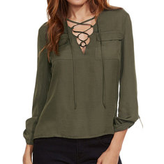 Les femmes occasionnels à manches longues v-Neck Lace Up Bandage Blouses en mousseline de soie